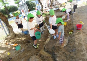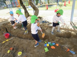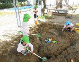 砂場では、なんとなく山を作り始めたことをきっかけに、「川つくろう。」「いいね。」と、友達を誘い合う姿もよく見られるようになりました。