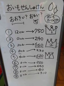 子どもたちが予想で選んだ①③⑤の芋が1・2・3位となりました。