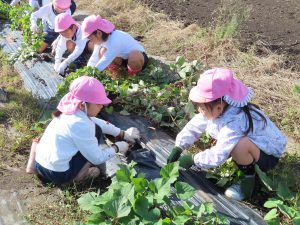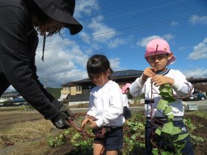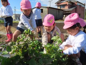 前日に絵本で、土の中に眠るサツマイモVS人間の子どもたちの綱引きを見ていたので、つい掛け声も綱引きのようになり、「よいしょ!よいしょ!」と力いっぱい引っ張ります。