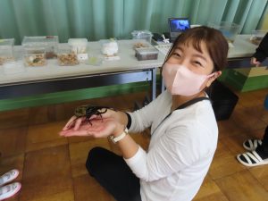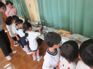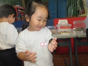 (年長児が環境教育推進員の先生をお呼びして、虫の罠について質問したり、話を聞かせていただいたのです。その時に虫の標本や、生きているものを持ってきてくださったので、年中・年少も見せていただきました。)