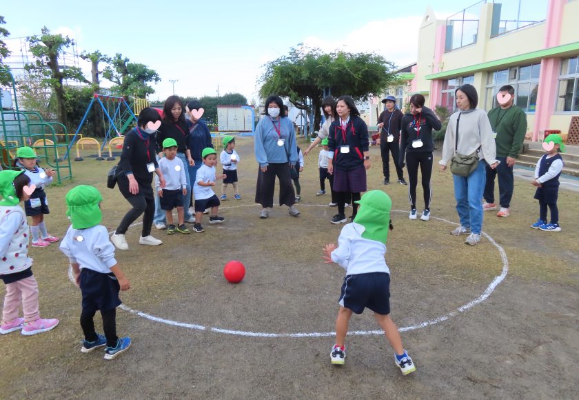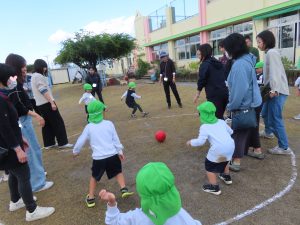 前の週の金曜日、子どもたちに転がしドッジボールをお家の人とやろう!と伝えると、「やったぁ!」と喜び、「エイエイ、オーしよう!」と、子どもたちは気合十分でした。