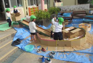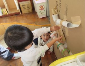 ↑教師が少しどんぐりが転がる道を作っておくと、そこでどんぐりを転がし、長くしたいという思いで材料を工夫してくっつけていました。