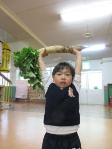 「見てみて!」朝や放課後に収穫した冬野菜を見せてくれる子もいます。
