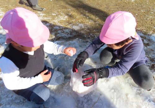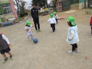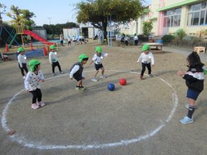 ボールが2個になり、逃げる子は大変!でも、ボールに注目すると当たりにくいことを繰り返し遊ぶ中で自然に学んだようで、より自分たちが楽しめる遊びの方法を考えだしたのでしょうね。