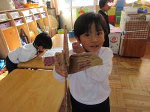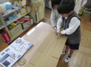 1枚ではペラペラで曲がっちゃうから、重ねよう!と、段ボールを重ねて作る工夫も。