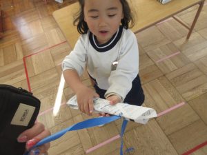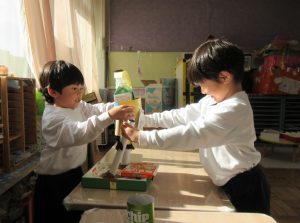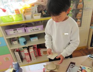 給食を食べ終わると早速、観劇で見たおもちゃを作り始めていました。すぐに遊びに取り入れる力がすごいです!