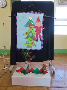自分たちで作ったクリスマスの掛け軸。ツバキの花とヒイラギは、講師の先生が用意してくださいました。
