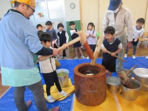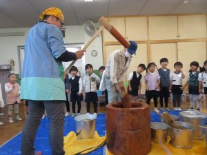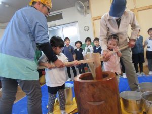 たかしおじいちゃんと、お父さんボランティアの方が、餅米を潰してくれました。