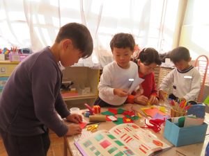 さすが折り紙が得意な子どもたちです。「サンタとソリを合体したらいいんじゃない?」「リースも前に作ったことあるから、作れそう!」とアイディアも次々浮かんできます。