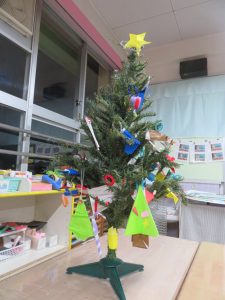 来週はクリスマスですね。保育室でもクリスマスツリーを飾っています。