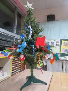 とても豪華なツリーに仕上がりました。てっぺんの星もどうしたら倒れてこないか、見栄えよく飾れるか、A君が試行錯誤してモールをうまく使い引っ掛けています。