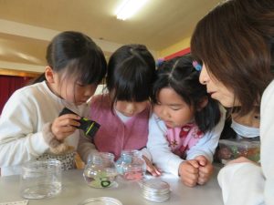 それでもなんとかしたい子どもたちは、「バイキンを石鹸で洗ったら、卵は守れるのかな?」「お母さんと卵を分けたらいい?」など、思いつく方法を提案していました。やはり、それも難しいとわかると、残念そうでしたが、もう1匹いる卵を抱えたザリガニをどう飼育していくかという点に、気持ちが向いていきました。お母さんザリガニと卵を育てていくためのエサや環境も教えていただきました。気をつけて育てていこうと思います。卵が孵るのは、春頃だそうです。卒園までに見られるといいなと話しています。
