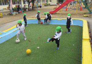 園庭では、引き続き、サッカーや大縄跳び、転がしドッジボールなどを楽しんでいます。