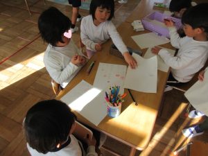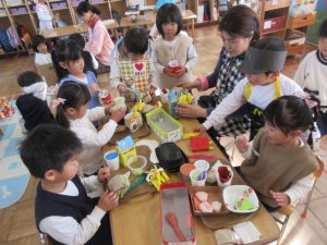 先日は、「先生は、小学校の先生ね。」と、役割を伝えられたので、「キーンコーンカーンコーン」と、チャイムを口ずさむと、子ども役の子がやってきました。