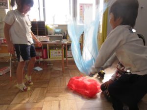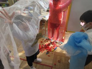 赤が火、水色は火を消すための水、白は煙だそうで、子どもたちは特に言葉で伝えなくても分かるようで、自然と集まって火を増やしたり、水をかけたりしていました。