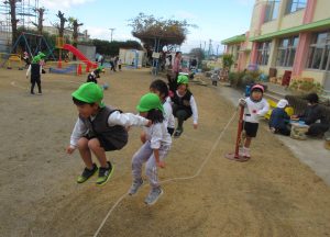 大縄跳びで縄を回すのが難しい子も、遊び方を変えて楽しめるようにしました。