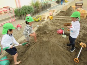 ↓大きな山をまた作っています。こあら組のより大きいかな?と確認しながら、「水をかけて固めるね。」「じゃあポンポンするわ」と役割分担していました。