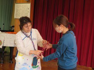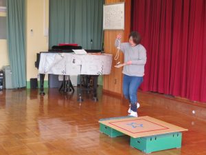 次は「あやとり」です。『流れ星』『四段はしご』『二人あやとり』です。1本の紐が様々な形に変化するので、魔法がかかったように見えたかな?!