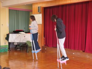 最後は園長先生と養護教諭による「竹馬」の披露です。子どもたちが乗っている竹馬より高い竹馬です。竹馬に挑戦したことがある子は、難しさを知っている分、拍手が大きかったように思います。