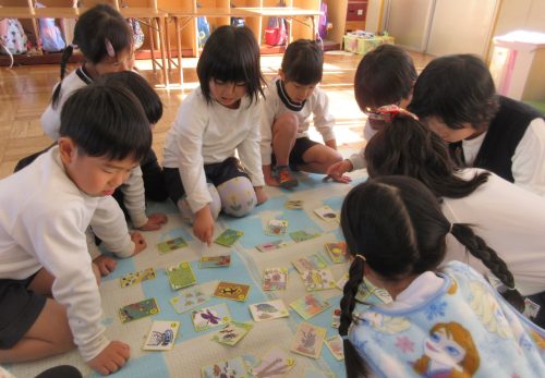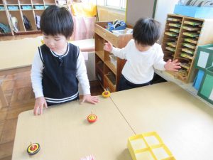 また、保育室ではパズル・メモリーカード・絵合わせ・こま等で遊んでいます。