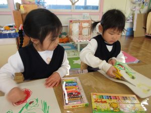 メッセージや絵を描くと喜んでくれると思う!!と気持ちが高まり、こあら組の子は部屋に戻るとクレヨンで絵を描き始めました。