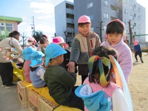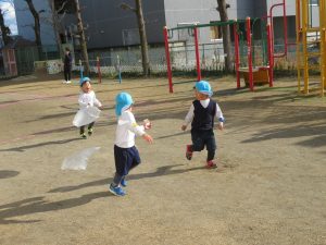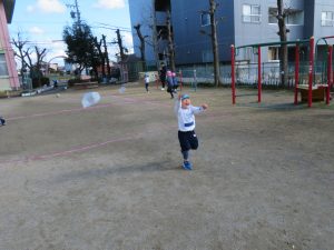 ビニール袋を使って凧を作り凧揚げをしました。風に負けないくらい元気に走り回ります。