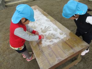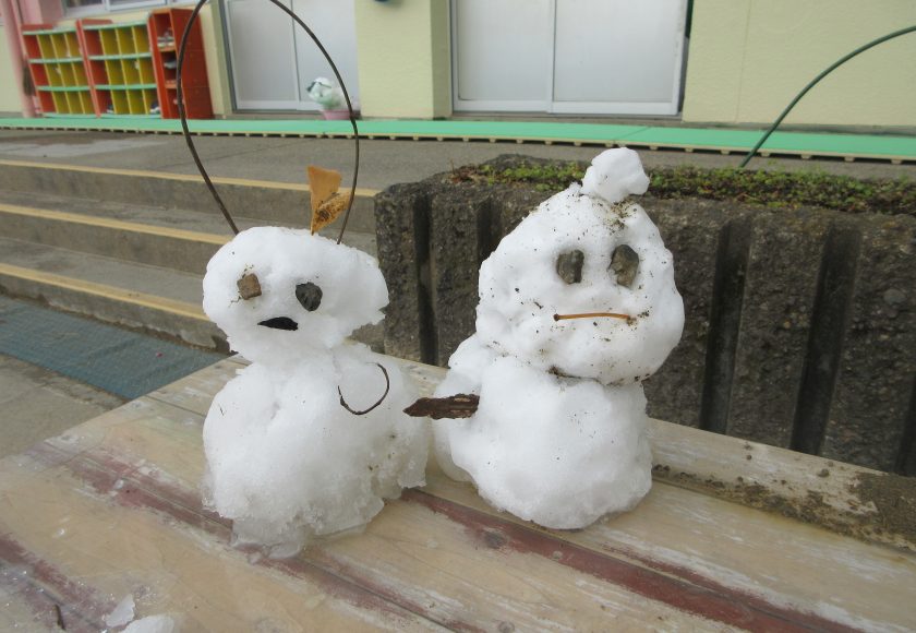 三連休の間に降った雪で少し遊びました。「冷たい〜」と言いながら、園庭の雪をかき集めて雪だるまを作ったり、雪を投げたりして遊びました。