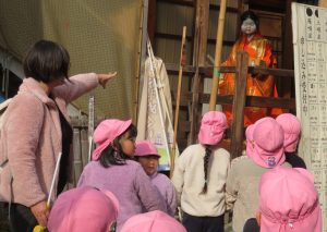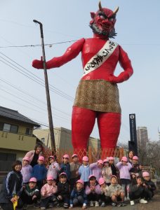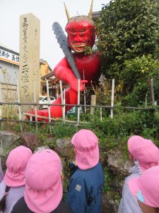 加納地域に立つ3体の鬼を見て、「金棒持っている」「角と牙がある」「鬼のパンツ、トラ柄?ヒョウ柄?」と細かいところも見ていました。