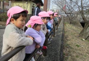 帰り道では清水川にいるカモや魚を発見して、行方を追ったり、魚の多さに数を予想したり・・。