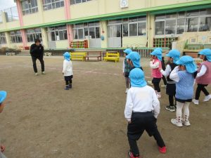 ボールを上に投げて取る、下にバウンドしたものを取ることをしました。コーチの見本を見ていると「簡単」と言っていましたが、実際にやるとボールがあちこちに転がります。子ども達は何度も挑戦していました。「できた!」ボールが取れた時の表情がとてもキラキラしていました。