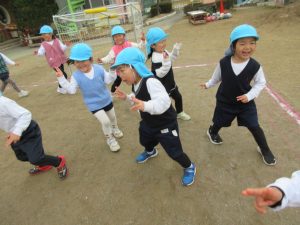 次はカニ歩きでの鬼ごっこです。普段使わない体の動きなので、逃げたい気持ちはあるけど慣れない横の動きに必死です。