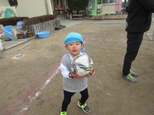 体が温まり、いよいよボールが登場です。一人一つずつ、ボールを選びます。同じボールを手に取った時「いいよ」と譲る声が聞こえました。また、譲ってもらったことにより「ありがと!」とお礼を言えることに思いやりの気持ちが育まれているなと嬉しく思いました。
