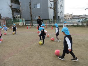 ボールとお散歩することを『ドリブル』と教えてもらいました。自分のボールから目を離さず、蹴ることは簡単そうに見えてとても難しく、足がボールにとどかなかったり強く蹴りすぎてしまったり・・・それでも自分のボールを一生懸命に追っていました。
