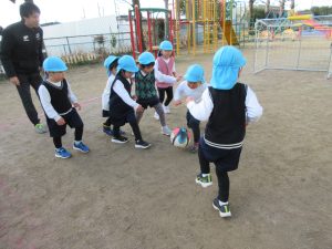 最後は先生VSこあら組のゲームです。ボールは1つ、ボールは手で触らないというルールでスタートです。子ども達は手で触らないように気を付けていたのか、ボールを追いかけて砂場やブランコの方までボールを追いかけます。