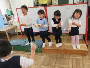 2学期にステージの上で歌った経験を思い出したのか、「台を作って欲しい!!」と子どもの声に台をつなげると早速ステージにのって演奏会が始まりました♬