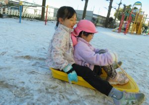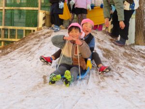 年少・年中組がしていたそり遊び。土が増えた泥山から、そりに乗って勢いよく滑り降りるのが大人気で、たいよう組も何度も繰り返し楽しみました。