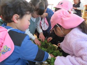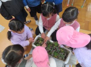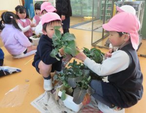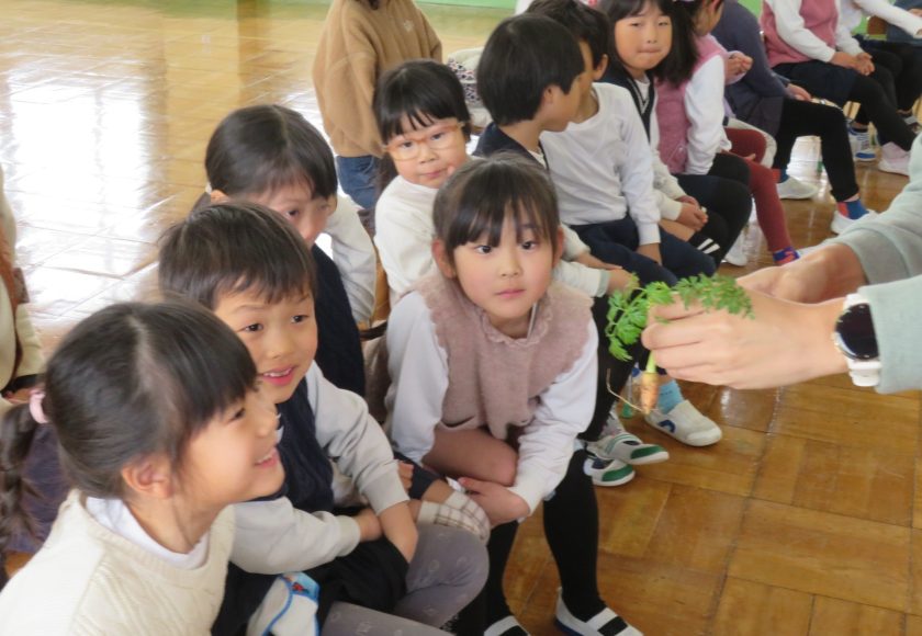 「ニンジンの細くて長い根っこ、見えるかな?ここから何を吸っているのかな?」「たくさん栄養をとるためには、根っこが長く、広い方がいいか、短くて、狭い方がいいか、どっちだと思う?」「プランターの中にたくさん植えてしまうと、隣の株とぶつかっちゃって、ケンカになっちゃうね。」など、子どもたちに分かりやすく、説明したり、自分で考えられるように投げかけたりしてくださいました。