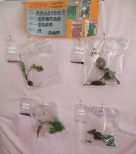 4種類の中で、一番身近なニンジンは、長さ6センチほどにしか育っていなかったのです。「長くないし、太くない。」「お店に売っているのと、全然違う。」「そのまま、育てていれば大きくなるのかな?」「水もあげたし、草も抜いたのに・・。」と、『不思議に思う気持ち』はどんどん膨らんでいきました。