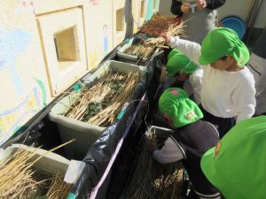 子どもたちには、イチゴを寒さから守るためと伝えましたが、他にも、藁の養分が土に行き届くとか、実ができたときに直接土に触れて腐るのを防ぐとかの目的があるようです。