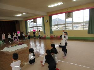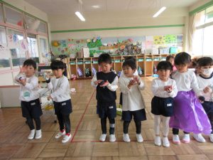 帰りの会前に「大根抜き」をしました。大根の子は抜かれないように腕をしっかり組んでいます。(最初の写真です)
