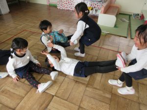 引っ張る子は、大根(足首)を引っ張ります。(ケガのないように、他の部位はひっぱらない。足首を引っ張る引っ張るということを守っています。)