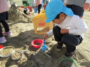砂場で遊んでいた子が「コーヒーできました」と声をかけてくれたので、遊んでいた子と砂場喫茶店に行きました。