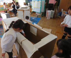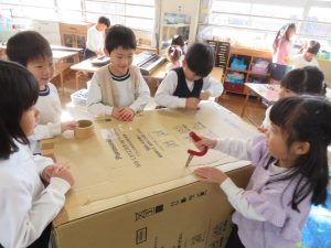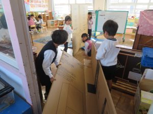 電気屋さんのご協力で集まった、大きな段ボールが大活躍です。