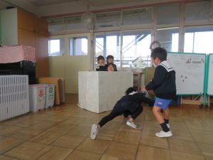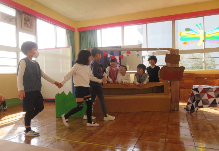 早速、船を作ったお話のチームは、対決のシーンを再現していました。大道具ができると、イメージも膨らみ、なりきり度もアップした気がします。