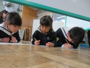 それぞれのセリフも、やりとりの中で生まれていきますが、「自分のセリフを覚えてきたいから、メモしておく。」と言う子がいると、「じゃあ、私も!」と自分たちで書き始めました。(いつもなら、「床じゃなくて、机の上で書いたら?」と声を掛けるところですが、この真剣なまなざしに、この日はそっと見守りました。)