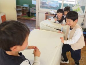 「先生!船が2ついるわ。大きな段ボールって、使える?」と自分たちで考え、運び始めました。
