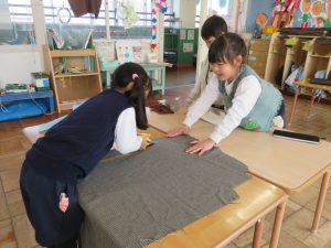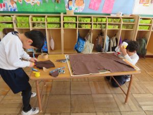 布の裁断だけでなく、布の端を接着するために、ボンドで貼り合わせたり、毛糸で縫い合わせたりするなど、日頃の遊びで経験したことや知った方法をうまく取り入れていました。