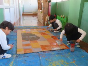 船の周りに白い紙を貼って、文字を隠していったのですが、これがとても大変で、保育室に用意していた紙が尽きると、子どもたちが慌てて、職員室へ貰いに行きました。糊を塗る役、紙を貼り付ける役、紙を配る役、紙を小さく切って、小さな隙間に貼れるようにする役など、自分たちで自然と役割分担し、見事な連係プレーを見せてくれました。