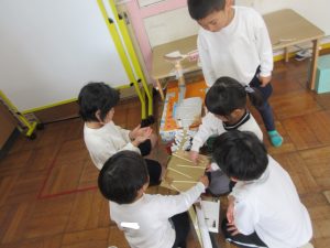 転がしてみて、ビー玉が止まると、「ここでぶつかるでや!」と、ハサミで切ったり、「ガムテープ貼りすぎると、ビー玉が引っかかる」ということに気づいて友達に伝えたりしています。
