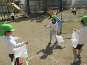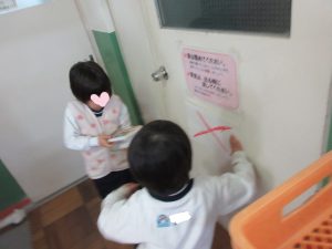 お別れ会のかくれんぼでは、なつめ組が中心となり、隠れたら危ないところを考えて、印を付けました。